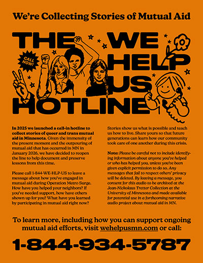 In 2025 we launched a call-in hotline to collect stories of queer and trans mutual aid in Minnesota. Given the immensity of the present moment and the outpouring of mutual aid that has occurred in MN in January 2026, we have decided to reopen the line to help document and preserve lessons from this time.